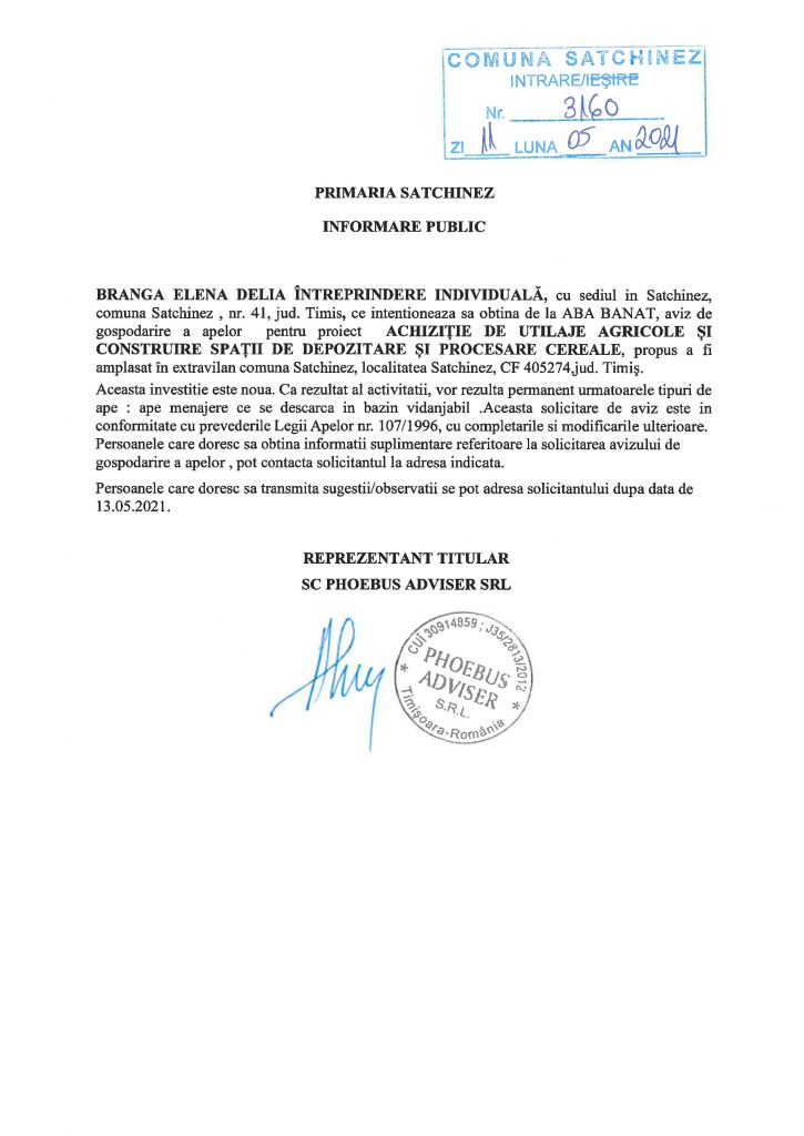 Anunț public Branga Elena Delia I.I. – Achiziție de utilaje agricole și construire de spații de depozitare și procesare cereale