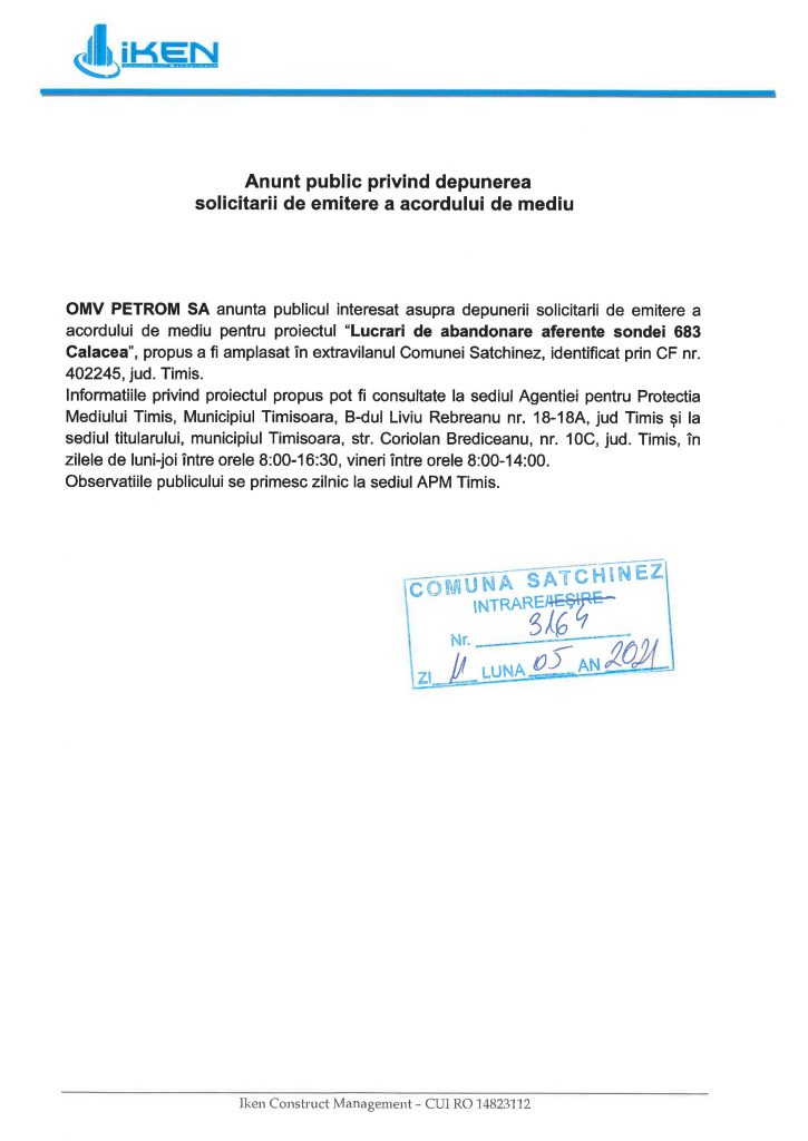 Anunț public OMV PETROM SA – Lucrări de abandonare aferente sondei 683 Călacea