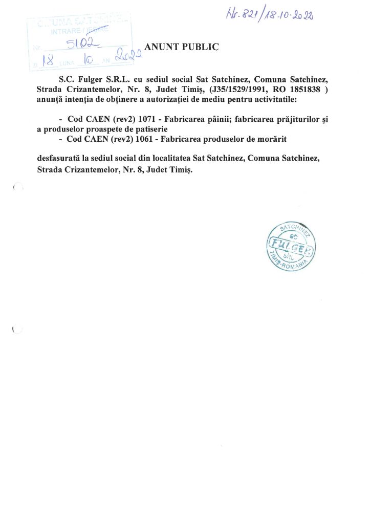 Anunț public – autorizație mediu – S.C. FULGER S.R.L.