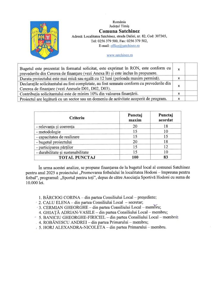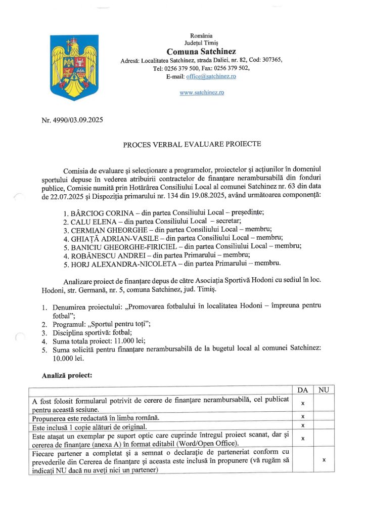 Comuna Satchinez informează publicul că în urma ședinței Comisiei de evaluare și selecție a proiectelor depuse în cadrul programului de finanțări nerambursabile pe anul 2025 – domeniul sport, a fost finalizat procesul de analiză și punctare.