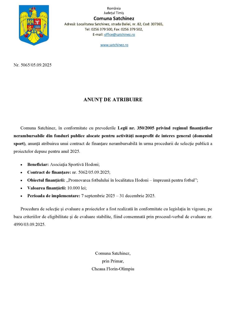 Anunț atribuire contract finanțare nerambursabilă sport 2025