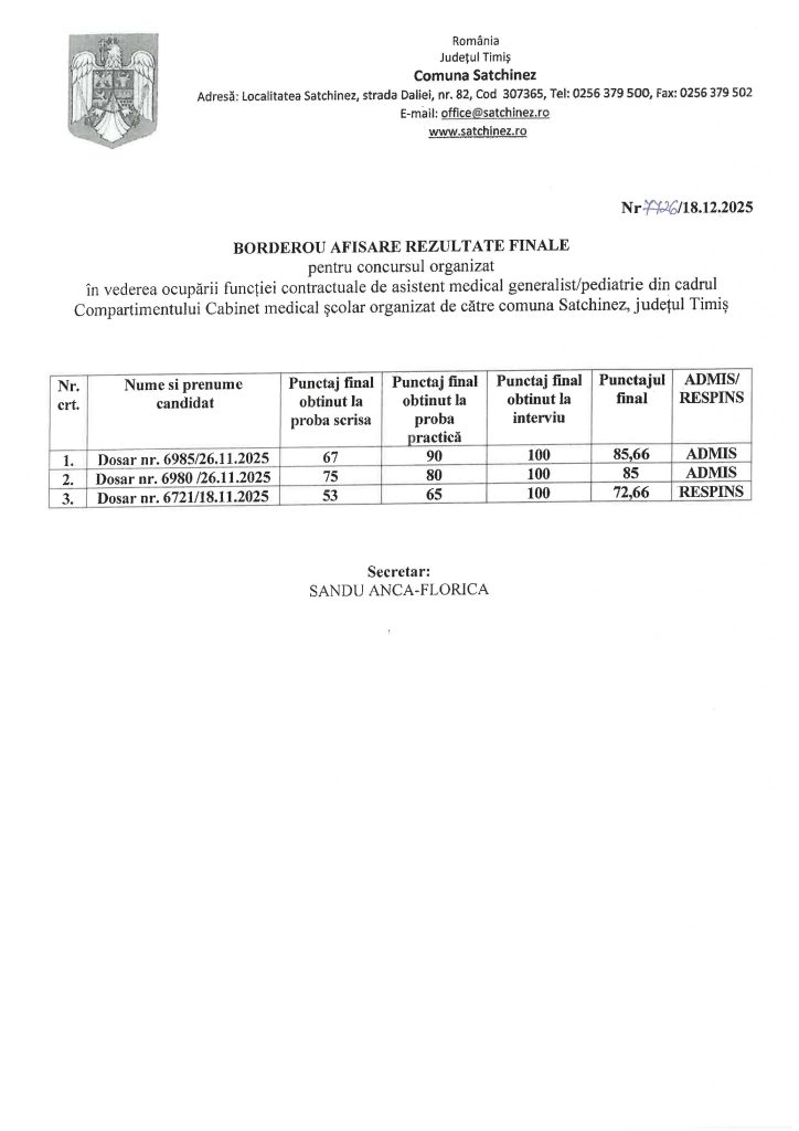 Borderou afișare rezultate finale concurs asistent medical debutant generalist-pediatrie